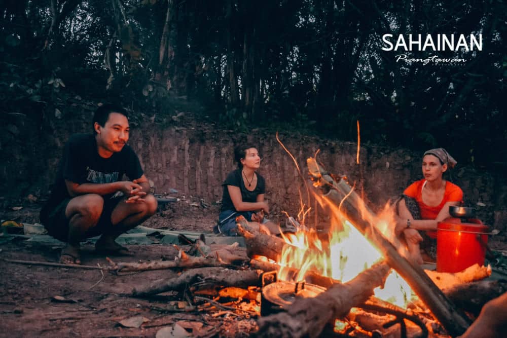 Sahainan operates entirely off-grid: small solar panels provide electricity, spring water flows from the mountaintop, cooking is done over firewood, and structures are hand-built from bamboo, mud, and teak wood. The food forest produces cashew nuts, rambutan, avocado, banana, papaya, mango, jackfruit, durian, coffee, rice (sticky, black, and brown varieties), ginger, turmeric, cardamom, moringa, sacha inchi, passion fruit, cotton, and dozens of medicinal herbs and vegetables. Seed saving and community seed exchange are central practices.