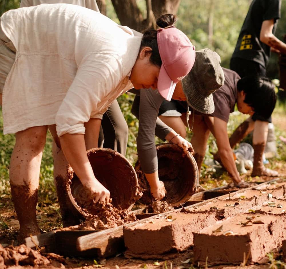 Furthermore, we have a lot of experience in Natural Building. Our main focus is to use recycled and locally sourced materials to create harmony with the earth. This is why we teach and construct using upcycled coffee jute bags. Our next step is exploring the potential of discarded “Fast Fashion” garments as building insulation or structural filler.